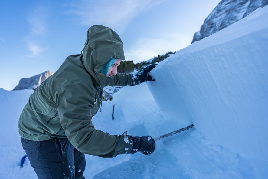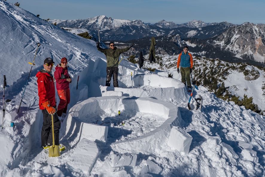 Am Samstag machten wir uns auf den Weg zu einem am Vortag von Martin und Hannes erkundeten Platz, wo die Schneelage perfekt für unser Vorhaben war. Durch Verwehungen komprimierter Schnee in perfekter Schneemächtigkeit mit Option auf eine Schneehöhle (Plan B) unter dem Niederen Ochsenkogel (2220 m).