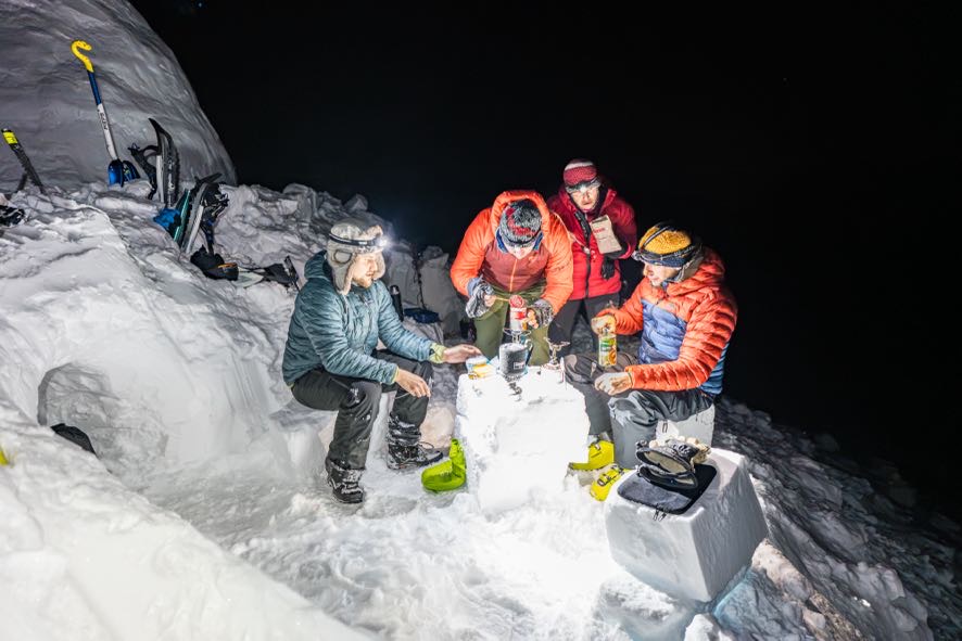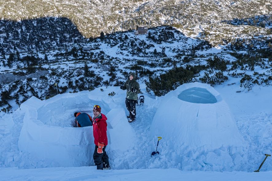 Das Schlafsetup funktionierte gut, auch wenn sich durch Kondensfeuchtigkeit die Außenseite der Schlafsäcke leicht benetzte. Das Handy gab aufgrund der Feuchtigkeit kurzfristig den Geist auf, sodass das Zeitgefühl in der Nacht und am Morgen schwand. Ohne Fenster war es schwer einzuschätzen, wie spät es war. Gegen sieben Uhr in der Früh am Sonntag standen wir schließlich auf, packten zusammen und ließen die Iglus auf dem Weg zur Hütte zurück.